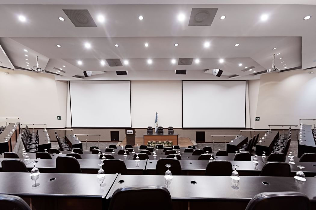 69 m² cinema-style auditorium with 112 seats, ideal for strategic or academic presentations.