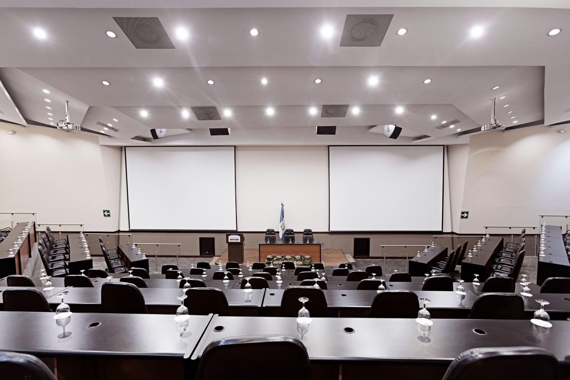 Our main auditorium, perfect for high-impact executive presentations with stadium seating, laptop connectors, and dual projection screens.